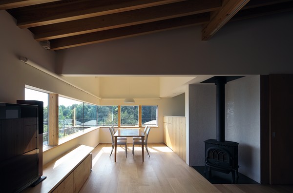 窓から見える山の景色と、薪ストーブのあるリビング。